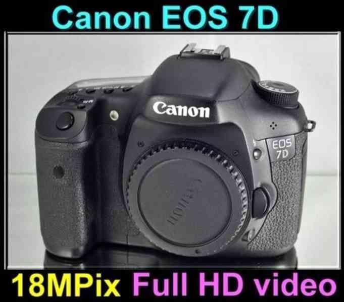 Canon EOS 7D je výkonná polo-profi digitální zrcadlovka, která nabízí 18MPix CMOS snímač (aps-c), sekvenční snímání 8 snímků za sekundu, rozsah ISO až 12800, 19 bodový autofokus, 100% pokrytí hledáčku, možnost natáčet Full HD video, 7.5cm LCD displej, tělo z hořčíkové slitiny a mnohé další velmi zajímavé vlastnosti.