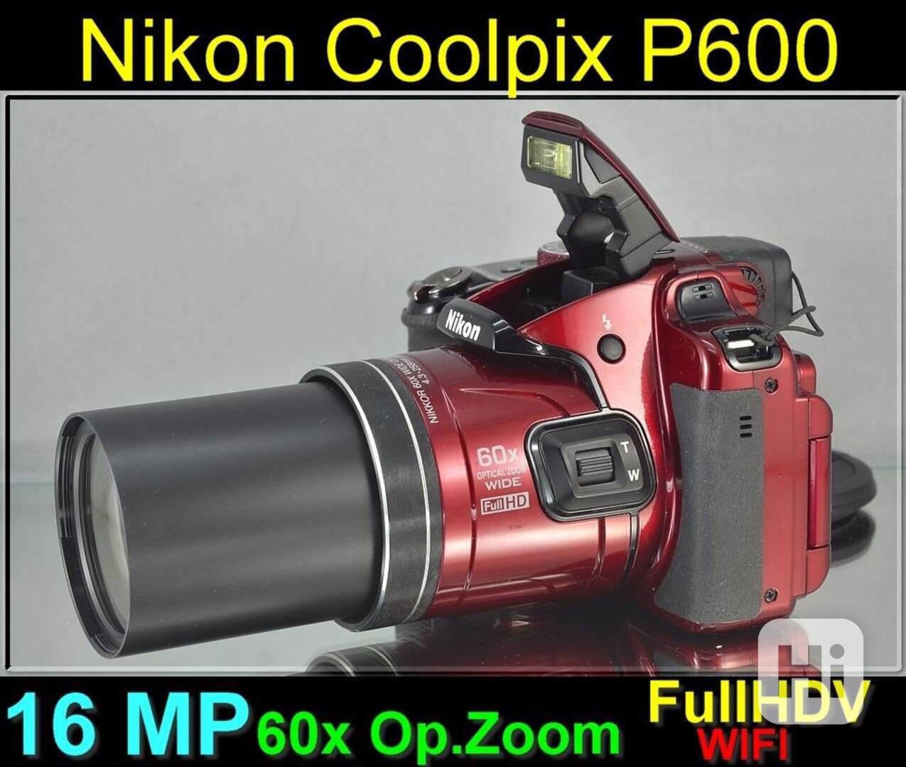 16 Mpx CMOS snímač s technologií přímého osvětlení, obrazový procesor EXPEED C2, 60× optický zoom (24-1 440 mm), optická stabilizace obrazu (VR), výklopný 3,0" RGBW LCD displej, video v Full HD kvalitě, 21 motivových programů, wi-Fi konektivita. Nikon Coolpix P600 je ultrazoomový digitální fotoaparát s jednoduchým ovládáním a širokorozsahovým zoom objektivem NIKKOR s 60 násobným přiblížením obrazu. Je vhodný pro začínající i pokročilejší fotografy. Vlastní 16 Mpx CMOS snímač s technologií přímého osvětlení, obrazový procesor EXPEED C2, optickou stabilizaci obrazu, výklopný 3,0" RGBW LCD displej s rozlišení 921 tisíc bodů a 21 motivových programů. Video natáčí ve Full HD kvalitě. Pomocí vestaveného připojení WiFi můžete sdílet svoje kvalitní snímky nebo videa přímo do vašich chytrých mobilních zařízení a z nich je můžete sdílet na vašich oblíbeních sociálních sítí.Velkou výhodou Elektronický hledáček s úhlopříčkou 0,2" a rozlišením 201 000 bodů.