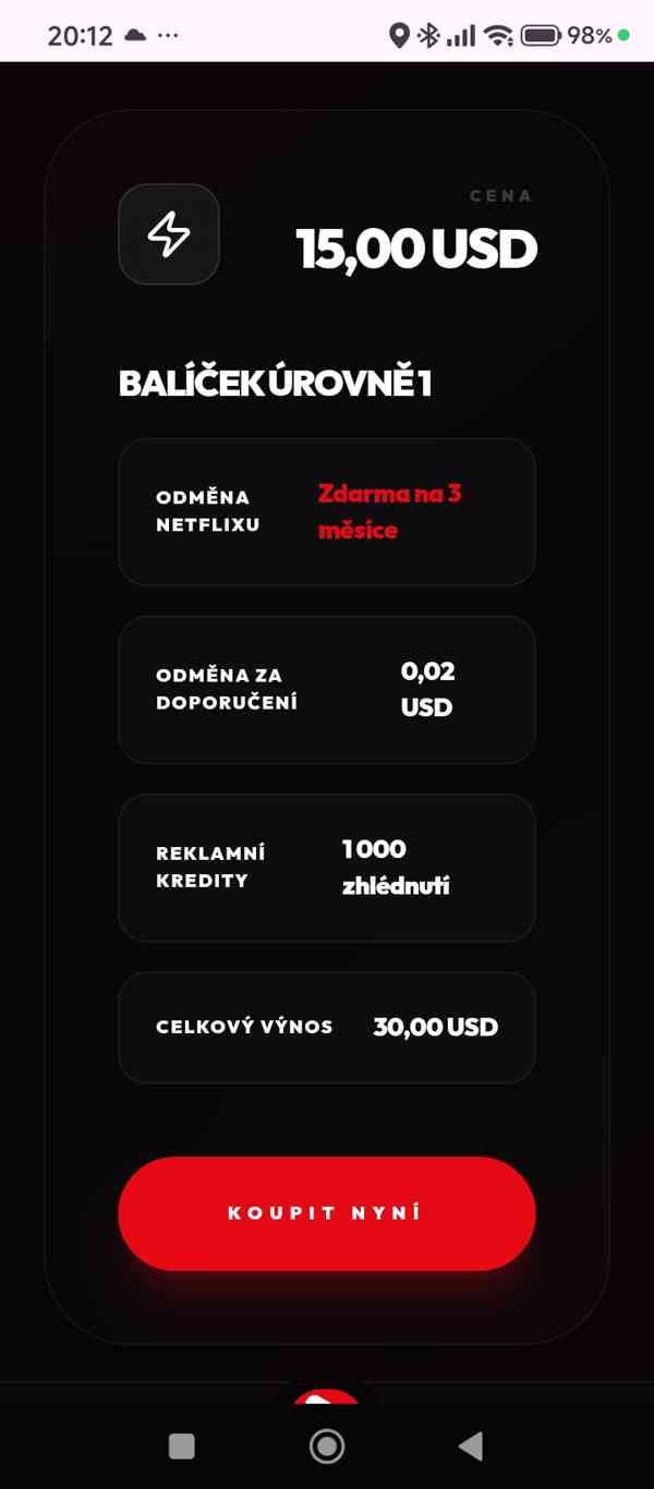 Zajímavý projekt ve kterém můžete vydělávat , ale i zároveň se bavit díky streamovací společnosti Netflix! Po registraci do projektu který je spouštěn zakoupíte si balíček za 15 USD a tím pádem vám firma vygeneruje kód na Netflix na 3 měsíce zdarma. Dále můžete každý den kliknout na 15 reklam za které dostanete zaplaceno asi 3.75 USD každý den.